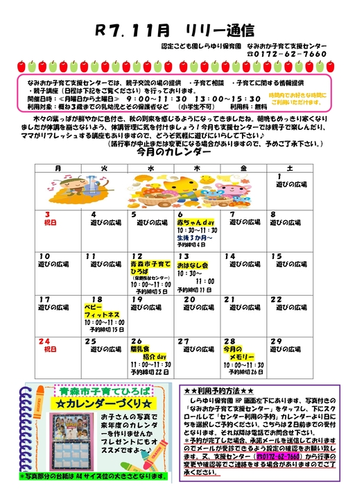 しらゆり保育園HP画面左下にあります、写真付きの「なみおか子育て支援センター」をタップし、下にスクロールして「センター利用の予約」カレンダーより日にちを選択しご予約ください。こちらは2日前までの受付となります。それ以降は電話でお問合せ下さい。