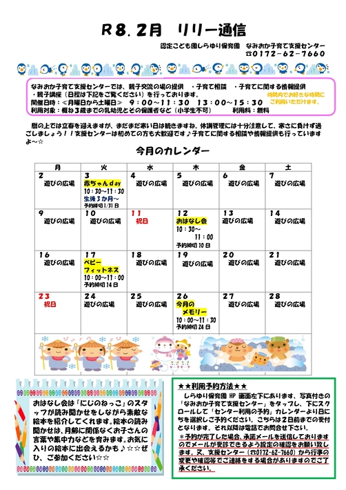 しらゆり保育園HP画面左下にあります、写真付きの「なみおか子育て支援センター」をタップし、下にスクロールして「センター利用の予約」カレンダーより日にちを選択しご予約ください。こちらは2日前までの受付となります。それ以降は電話でお問合せ下さい。